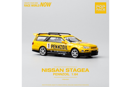 Pop Race 1/64 Nissan Stagea GT-R (R34) Wagon in Pennzoil Yellow Livery